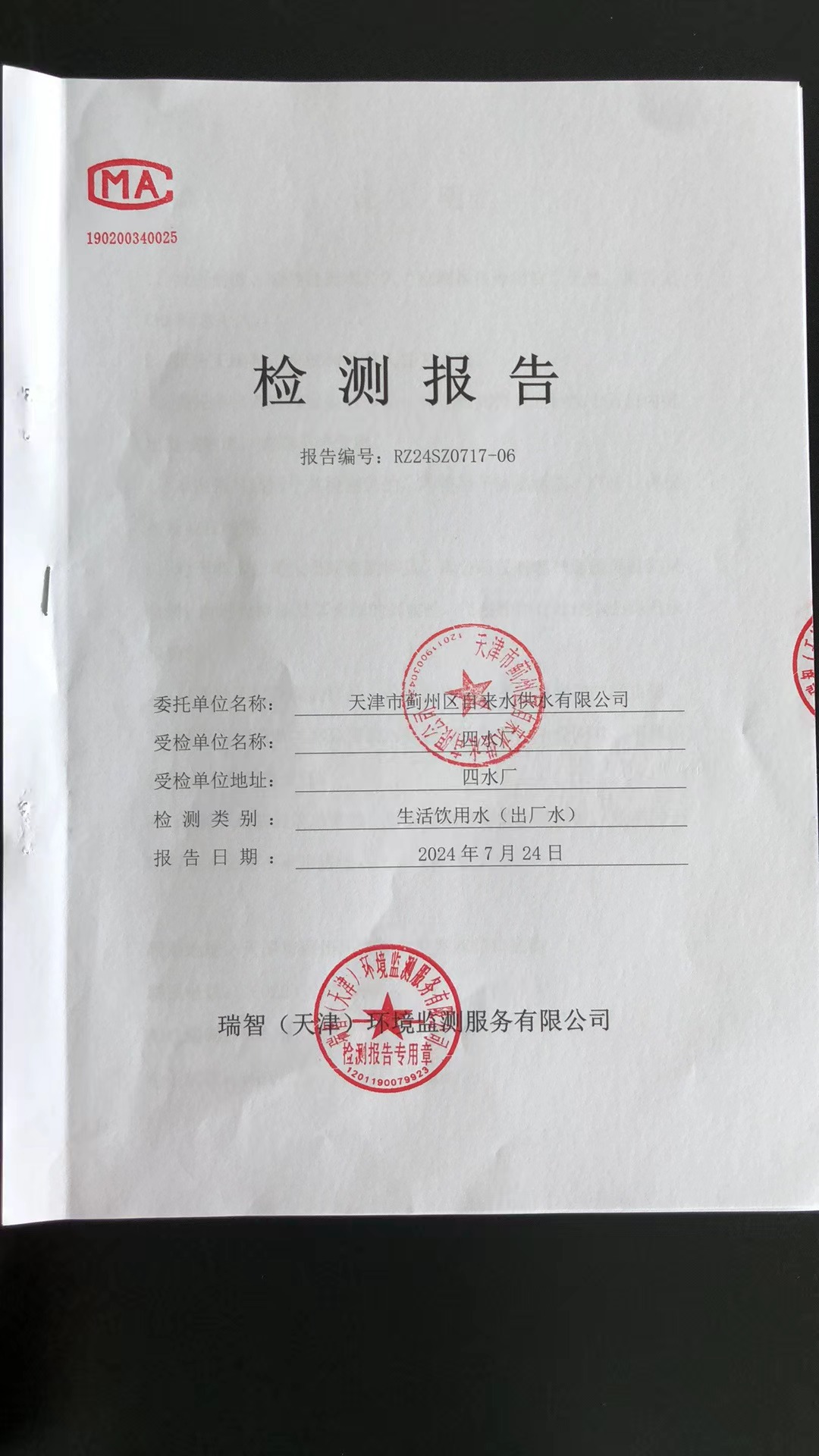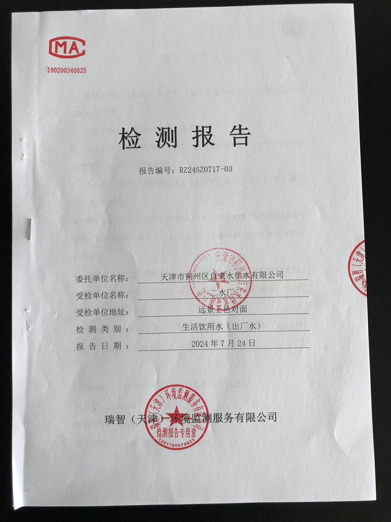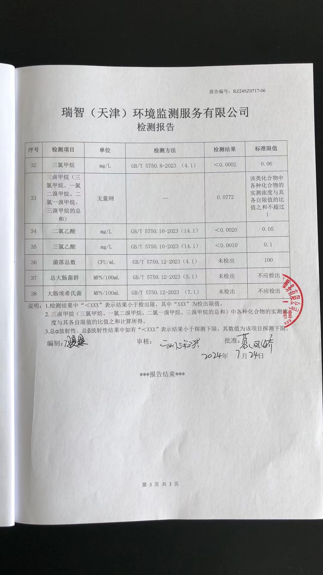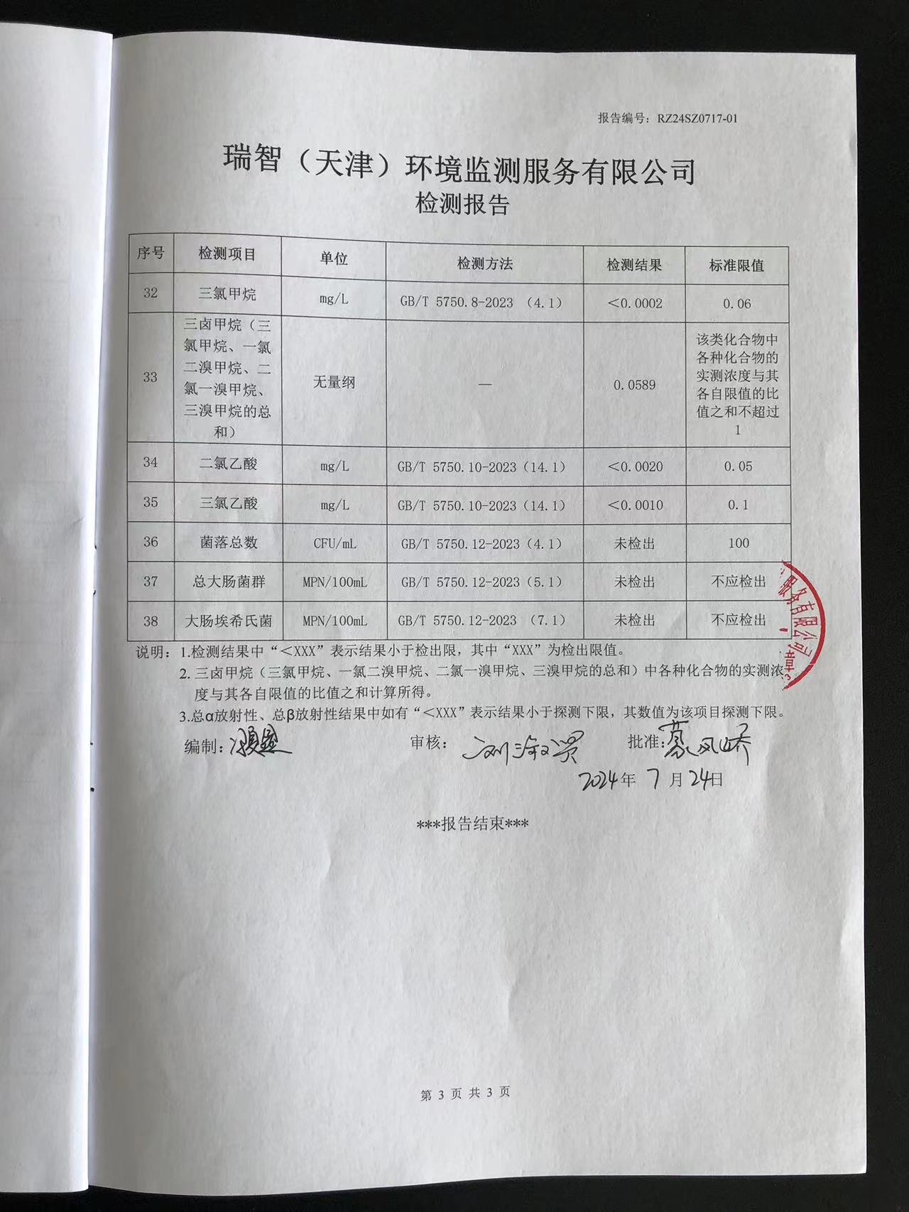 2024年7月份水質(zhì)檢測報告